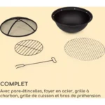 • Complet : avec pare-étincelles, foyer en acier, grille à charbon, grille de cuisson et bras de préhension