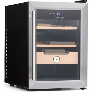 Le lieu de stockage à la pointe de la technologie pour le plaisir du tabac noble : la cave à cigares Klarstein El Presidente 37 assure des conditions de stockage optimales pour préserver à long terme le plein arôme des cigares nobles. Dans l’espace intérieur de 37 litres, deux niveaux de stockage et un compartiment de stockage en bois de cèdre offrent beaucoup de place pour tes cigares : silencieux, parfaitement refroidis et avec une surveillance optimale de l’humidité de l’air. L’éclairage intérieur bleu crée une scène stylée derrière la porte vitrée panoramique.
