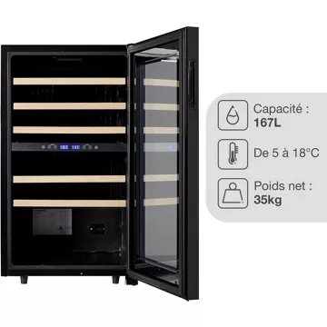 • Alarme de température : oui, permet d’être averti si la température de la cave à vin sort de la plage de températures recommandée et donc de protéger vos vins contre les dommages causés par une température trop élevée ou trop basse.