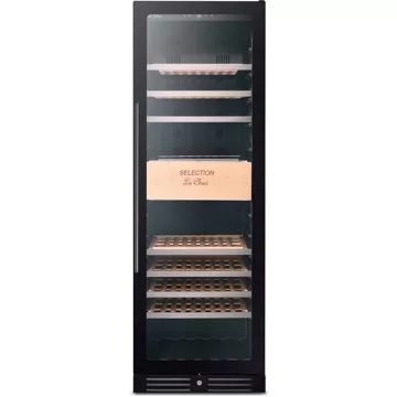 - Type de porte : vitrée, permet de visualiser facilement les bouteilles sans avoir à ouvrir la porte, ce qui réduit la circulation de l’air dans la cave et donc la variation de la température. Le traitement anti-uv protège le contenu.