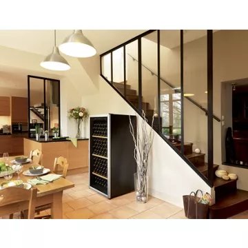 - Type de porte : vitrée, permet de visualiser facilement les bouteilles sans avoir à ouvrir la porte, ce qui réduit la circulation de l’air dans la cave et donc la variation de la température. Le traitement anti-uv protège le contenu.