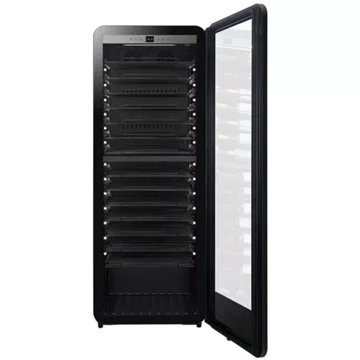 - Type de porte : vitrée, permet de visualiser facilement les bouteilles sans avoir à ouvrir la porte, ce qui réduit la circulation de l’air dans la cave et donc la variation de la température. Le traitement anti-uv protège le contenu.