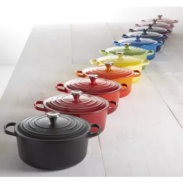 Cuisson au Four : La température maximale supportée par les produits dont les boutons de couvercle sont en phénolique noire est de 200°C / 392°F / thermostat 5 (en Europe thermostat 6 pour les fours à gaz). Les produits comportant des poignées en fonte ou en inox peuvent être utilisés à toutes températures. Les ustensiles munis de poignées ou de boutons en bois ne doivent pas être utilisés au four. Pour le bouton phénolique noir, la température maximale d’utilisation au four est de 200°C/390°F/Thermostat 6. Les produits avec poignées fonte et/ou bouton métal inox, ci-après, peuvent être utilisés au four sans limitation de température.Fours à revêtement en fonte : Ne placez aucun article de cuisson sur la sole d’un four habillé de fonte. Cela augmenterait la température de l’ustensil et accélérait donc la vitesse de cuisson au détriment de la qualité. Pour de meilleurs résultats, posez-le toujours sur une grille ou sur une plaque. L’émail noir satin est principalement utilisé sur des articles comme les grills, les skillets, les skillet grils, les poêles, les sauteuses, les woks, les tajines plus spécifiquement étudiés pour griller, frire et faire sauter et certaines cocottes. L’émail noir satin a été spécialement conçu pour cuire à des températures relativement élevées mais avec un réglage modéré de la source de chaleur. La fonte a une telle capacité de rétention de la chaleur qu’elle chauffe le récipient uniformément à feu moyen. Les températures élevées provoquent une surchauffe et une adhérence des aliments. Vous obtiendrez de meilleurs résultats à des températures moyennes et douces. L’émail noir satin à l’usage prendra une patine noir bruni. Celle-ci est liée à l’action des huiles et des graisses des aliments sur la surface chaude. Elle accroît la performance de la cuisson et le glissement des aliments sur la surface. À terme, elle permet d’utiliser moins de matières grasses.Griller : Grils et skillet grils exigent un préchauffage à vide qui permettra à la surface de cuisson d’atteindre la température élevée nécessaire pour caraméliser ou dorer. Ce conseil ne s’applique pas aux autres produits. Les marques typiques de grillade n’apparaîtront pas si la surface de cuisson est trop froide ou si l’aliment est trop humide. Utilisez le papier de cuisine pour éliminer l’excès d’humidité (y compris pour les aliments marinés). Pour éviter surchauffe et fumée éventuelles, ne chauffez pas d’huile dans une poêle froide. Placez le gril vide sur feu moyen et laissez-le chauffer. Trempez vos doigts dans l’eau et jetez-en quelques gouttes sur la surface chaude. Si elles grésillent et s’évaporent immédiatement, votre poêle est chaude et prête à être utilisée ; sinon, laissez la poêle chauffer encore et répétez le test de l’eau. Lorsque la surface est chaude, huilez-la légèrement à l’aide d’un vaporisateur d’huile ou d’un pinceau de cuisine en silicone Le Creuset. Pour que les marques de grillade soient bien nettes, laissez l’aliment suffisamment longtemps sur la surface de cuisson avant de le retourner, les aliments doivent se détacher tous seuls, sinon continuer la cuisson.Frire et faire sauter : Frire et faire sauter un aliment exige de faire chauffer le récipient et la matière grasse en même temps. Le corps gras est assez chaud lorsque vous observez sur sa surface, pour l’huile une légère ondulation ou, pour le beurre et les autres graisses, une formation de bulles ou de mousse.