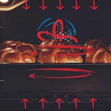 • Mode de cuisson : chaleur tournante brassée, le four est équipé de 2 résistances, une en bas (sole), une en haut (voûte) et d’une hélice placée au fond de la cavité qui permet de brasser l’air, pour une cuisson rapide et une repartition homogène de la chaleur.
