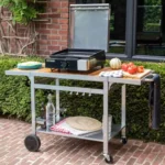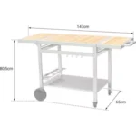 Cuisinez de bons petits plats à la plancha sur votre terrasse sans encombrer votre table de jardin. La desserte à plancha vous permet de préparer vos repas sur la plaque de cuisson tout en ayant vos ingrédients, assiettes et ustensiles à portée de main. Vous pouvez disposer votre vaisselle sur le plateau inférieur et les aliments sur les deux tablettes latérales, qui sont rabattables pour gagner de la place. Les 4 crochets permettent de suspendre vos ustensiles et les 3 porte-bouteilles d’accueillir huile, vinaigre ou boissons. Ce joli chariot à plancha a été conçu en bois et en acier pour garantir sa robustesse et le rendre élégant dans votre espace extérieur. Il est facilement déplaçable avec ses 4 roues.