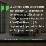 La DELONGHI Eletta Explore ne se contente pas de préparer des expressos classiques ; elle innove avec la technologie exclusive Cold Extraction, permettant de réaliser un Cold Brew en seulement 2 minutes et 30 secondes. Les utilisateurs peuvent également personnaliser leurs boissons grâce à l’application Coffee Link, qui offre plus de 120 recettes et la possibilité de créer de nouveaux mélanges. Avec ses 4 profils d’utilisateur, chacun peut sauvegarder ses préférences pour des boissons sur mesure. La machine est équipée d’un broyeur intégré avec 13 niveaux de mouture, d’un réservoir à grains de 300g et d’un réservoir d’eau de 1,8L, assurant ainsi une utilisation optimale et une grande capacité de production.