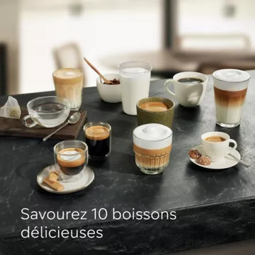 - Type de recettes : Espresso, Café, Doppio+, Americano, Aroma +, Café crème, Cappuccino, Latte Macchiato, Mousse de lait