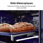 - Rails téléscopiques : ils permettent d’accéder à vos plats en les faisant coulisser en dehors de l’enceinte de cuisson en évitant les risques de basculement. Vous pourrez arroser confortablement votre rôti ou retourner facilement vos plats sans risque de brûlure.