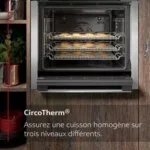 - Avantage de la chaleur tournante pulsée : le four est équipé d’un ventilateur et d’une résistance circulaire situées sur la paroi arrière du four, pour une cuisson simultanée de différents plats sur plusieurs niveaux
