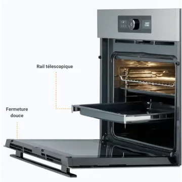 - Rails téléscopiques : ils permettent d’accéder à vos plats en les faisant coulisser en dehors de l’enceinte de cuisson en évitant les risques de basculement. Vous pourrez arroser confortablement votre rôti ou retourner facilement vos plats sans risque de brûlure.