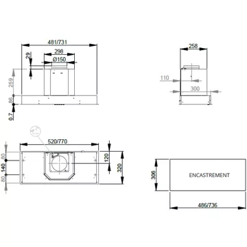 - Type de hotte : encastrable, s’intègre parfaitement dans les armoires, préservant l’esthétique de la cuisine. Elle offre une extraction efficace des fumées et odeurs tout en restant discrète. Son design discret et sa performance font d’elle un choix idéal pour les cuisines modernes soucieuses de leur apparence.