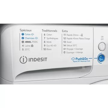 - Push & Go : plus besoin de programmer votre machine, vous n’avez qu’à appuyer sur un bouton pour allumer la machine, sélectionner et lancer le programme mix 30°C de 45 minutes.