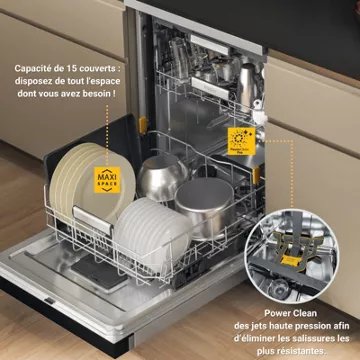 - Tiroir à couverts : Oui, il est placé dans la partie haute du lave-vaisselle et permet de bénéficier de 25% d’espace supplémentaire dans le panier inférieur