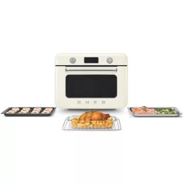 Doté d’une capacité de 30 litres et d’une technologie de cuisson multifonction, le SMEG COF01CREU offre une flexibilité culinaire sans précédent. Avec 10 fonctions de cuisson, incluant la vapeur pure à 100%, la chaleur brassée et la fonction Air Fry, ce mini four répond à tous les besoins, des plats traditionnels aux recettes les plus innovantes. La commande électronique permet un contrôle précis de la température, allant de 40 °C à 230 °C, et la minuterie électronique assure une gestion optimale du temps de cuisson. L’éclairage halogène et la porte abattante avec triple vitrage offrent une visibilité parfaite, tandis que les signaux sonores et l’alarme de réservoir d’eau vide ajoutent une touche de confort et de sécurité supplémentaires.