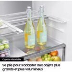 - Installation : porte avec débord, le réfrigérateur nécessite d’être installé à quelques centimètres du mur pour accéder facilement aux bacs et aux clayettes