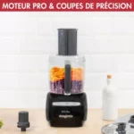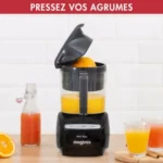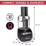 - Accessoires : boîte de rangement des accessoires, couteau hachoir, disque(s) râpeur, presse-agrumes, rapeur/Trancheur, spatule