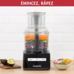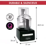 - Accessoires : 3 cuves (cuve standard, mini-cuve, midi cuve), boîte de rangement des accessoires, couteau hachoir, couvercle anti-projections, disque(s) éminceur, disque(s) râpeur, presse-agrumes, rapeur/Trancheur, spatule