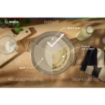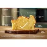 - Accessoires : batteur à bord flexible, malaxeur, fouet, couvercle anti-projections, crochet pétrisseur, fouet à fils, balance