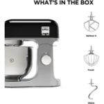 - Accessoires : batteur, couvercle anti-projections, crochet pétrisseur, fouet à fils, spatule