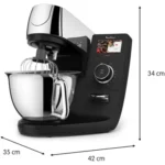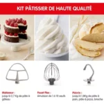 Le robot pâtissier I-COACH est idéal pour tous vos besoins, pour des préparations jusqu’à 30 personnes : sa grande cuve en inox de 5,5 L est idéale pour des préparations généreuses (jusqu’à 2,7 kg de pâte à gâteau), et ses accessoires brevetés s’adaptent aux quantités désirées : le fouet flex performant émulsionne de 1 à 10 oeufs de manière homogène, il est étudié pour récupérer votre préparation même sur les bords ; le malaxeur pour gâteau, pâte à crêpes et autres préparations légères est parfait jusqu’à 2,7 kg de pâte à gâteau, sa nouvelle forme asymétrique assure des résultats optimisés et plus homogènes ; enfin, le pétrin idéal pour les pâtes plus lourdes, les pains et les brioches est efficace jusqu’à 1,2 kg de pâte, la nouvelle forme de son crochet assure un pétrissage parfait, avec moins d’adhérence : la pâte ne se coince pas dans le crochet et celui-ci va chercher la pâte jusque sur les bords. La technologie de mouvement planétaire garantit que chaque recoin de la cuve est atteint pour une homogénéité parfaite. L’ouverture large facilite l’ajout d’ingrédients sans effort, même pendant l’utilisation de l’appareil, et sans ouverture du couvercle, et sa poignée confortable facilite sa manipulation.