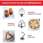 Il est équipé de 8 programmes automatiques directement intégrés dans l’appareil offrant une combinaison idéale durée/vitesse ; complété avec l’application gratuite, vous obtiendrez un guidage complet, 21 recettes essentielles en pâtisserie, des recettes sucrées et salées enrichies chaque mois, des conseils et astuces, des étapes de vérification et des tutoriels vidéos, pour maîtriser sans failltous les fondamentaux de la pâtisserie : Chantilly, pâte à tarte, à crêpes, à pain… Son utilisation manuelle avec 8 vitesses, dont une vitesse lente d’incorporation et une fonction Pulse, vous permettra de réussir toutes vos pâtisseries. Et sa balance de cuisine incluse, d’une capacité de 5 kg et dotée d’une fonction tare et d’une fonction liquide, assurera à vos préparations une précision au gramme près.