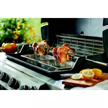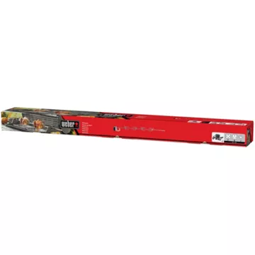 Conçue pour s’adapter à la cuve des barbecues à gaz des séries Genesis® II, Genesis® II LX 400 et 600, la rôtissoire Weber comprend un axe en acier inoxydable de 117 cm, deux fourches permettant d’accueillir des aliments de grosses tailles, les accessoires nécessaires et un moteur électrique qui fait tourner lentement les aliments au-dessus des grilles de cuisson.